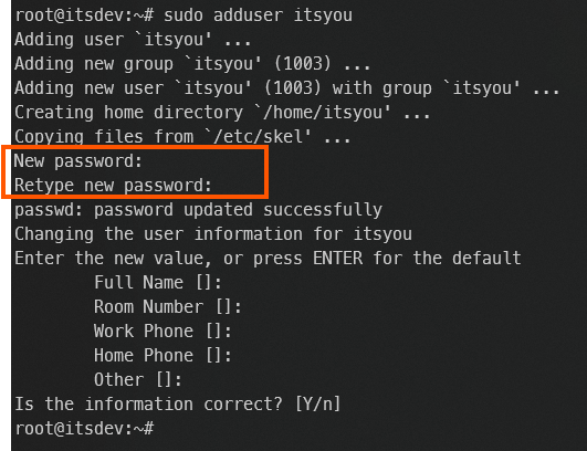 Ubuntu 또는 Debian 계열 리눅스 서버에서 새로운 사용자(유저 - user) 계정을 생성하고, 해당 사용자 (유저 - user) 에게 sudo(관리자) 권한을 부여하는 것은 시스템 관리에서 기본적이면서도 중요한 작업이다. 이 과정을 통해 서버를 여러 사용자가 안전하게 공유하거나, 루트 계정을 직접 사용하지 않고도 시스템을 관리할 수 있다.1. 새 사용자 (유저 - user) 생성사용자 계정을 생성하려면 adduser 명령어를 사용한다. 이 명령은 사용자 (유저 - user) 홈 디렉토리와 필요한 초기 설정을 자동으로 구성해준다.sudo adduser 사용자아이디예:sudo adduser itsyou명령을 실행하면 비밀번호 설정, 사용자 이름, 전화번호 등 몇 가지 정보를 입력하라고 나오는데, 대..